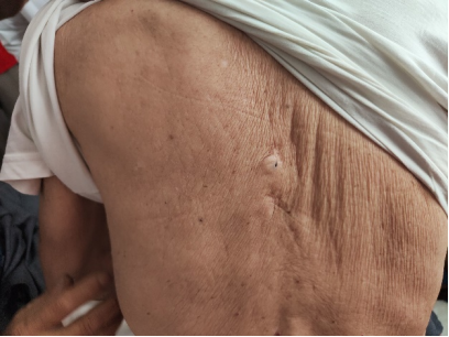 “我是爆破组、投弹组的,哪里过不去,我就拿一个小炸药包往里一扣,噗,炸个小口,投弹组随后就往上上。”宋五成老人掀开衣服向队员们展示当时战争被炮弹炸伤的伤疤。“背上有、脚趾上也有、腿上也有。”