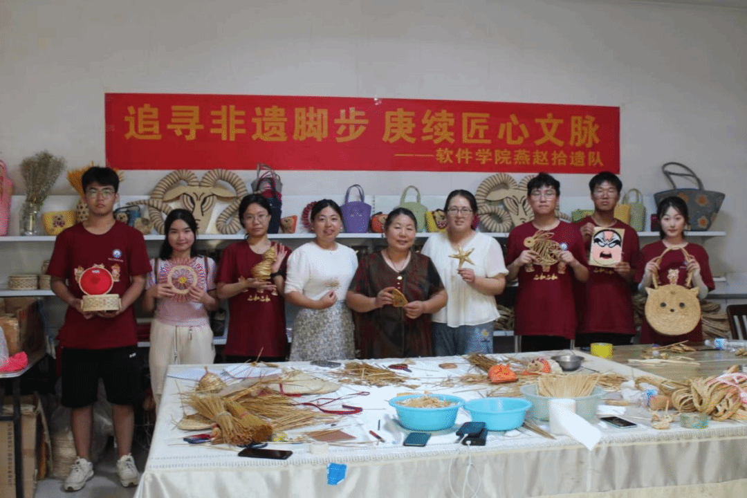 为了让同学们增进对非遗文化的认同和理解,培养同学们对民族优秀传统文化的深厚情感,促进非物质文化遗产的传承和发展。2023年7月22日,软件公司老员工暑期实践“燕赵拾遗队”的6名成员在郑曼老师和张跃也老师的带领下来到了邯郸市大名县,前往国家非物质文化遗产草编项目代表性传承人王群英女士的草编工作室开展研学实践。