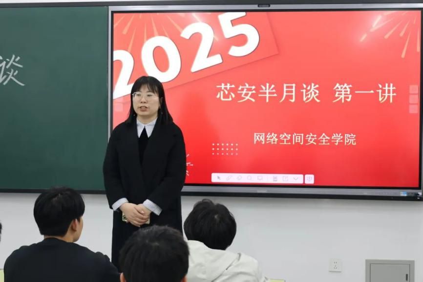 党总支书记、学管副经理樊风彩向与会师生介绍开展形式公司党总支书记、副经理樊风彩向与会师生介绍了开展“芯安半月谈”系列主题活动的初衷与开展形式,着力突出网络空间安全主题,同时关注新时代下思想聚焦、时政热点、现代化进程、改革进行时及员工发展需求等话题,为师生逐梦新征程凝勤学之心、聚信仰之力。