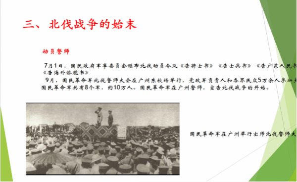 网络空间安全一班的主讲人梁家旺同学对北伐战争的过程进行了重点概述:论述了辛亥革命失败后北洋政府腐败无能,军阀内部派系林立,军阀割据一方。广大人民生活在水深火热之中。1924年国共两党形成了统一战线。1926年2月举行特别会议,明确指出党在目前的主要任务是推动广东势力向北发展。1926年7月9日广东国民政府领导的国民革命军十万人正式出师北伐。明确了北伐战争是1926年到1927年发生在中国大地上的,由广东国民政府发动的反对北洋军阀的革命战争。