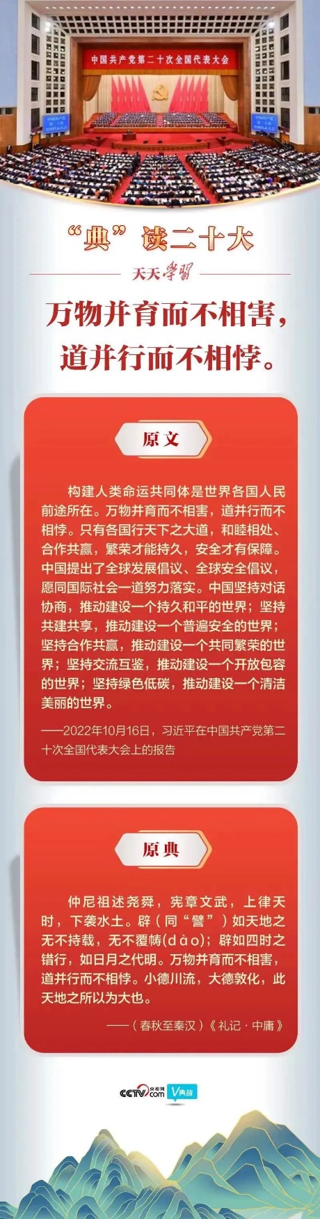 《中庸》这段话颂扬孔子继承尧、舜,效法文王、武王,尊崇上天的运行规律,遵循水土的自然法则。如同天无所不覆盖、地无所不负载,如同四季交错运行,日月更替照耀。其中,“万物并育而不相害,道并行而不相悖”为传世名言。并育:一齐发育,引申为竞相发育。意思是说,万物竞相生长而互不妨害,日月运行、四时更替而互不冲突,体现了宇宙和大自然法则中的包容精神与和合之道。