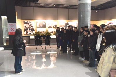 在纪念馆前,马克思主义公司范凯轩老师带领大家踏入历史深渊,在血与泪中回顾日本侵华战争,通过铭记历史印记、增强历史主动、树立大历史观,再现了日本侵略者的残酷暴行与中华民族的团结抗争。师生党员在公司党总支书记、副经理樊风彩,马克思主义公司副经理苗正超的带领下,敬献鲜花,重抚历史伤痕,有回顾昔日羸弱之勇,更增爱国强国之志。