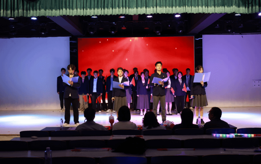 当经典与潮流碰撞,舞台成为文化传承的创新场域:2024级空间信息与数字技术3班团支部以“温情—俏皮—热烈”三重奏点燃气氛——《在你的身边》合唱如春日微风,《呲牙舞》灵动似精灵跃动,《最炫民族风》热舞掀起全场大合唱,传统民歌与现代街舞的混搭掀起狂欢;2024级网络空间安全2班团支部《星火燎原—从井冈山到中国梦》则以革命旧址沙画为背景,舞者以红绸为“火炬”,在《十送红军》旋律中演绎长征征程,朗诵声中“中国梦”主题沙画渐次展开,历史厚重感与时代使命感浑然一体;2024级空间信息与数字技术2班团支部《我的未来式》采用分组轮唱与和声交织形式,同学们以青春宣言为内容,加上配乐诗朗诵《青春中国》,朗诵者们以饱含深情的声音,回溯了中国从近代的沧桑屈辱走向如今的繁荣昌盛的艰辛历程,展现了青年的担当。