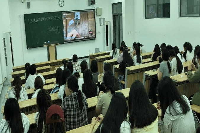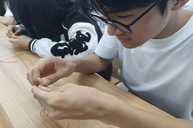 工作人员播放五彩绳编织视频,同学们从中感受编织魅力后,工作人员开始分发材料。面对五彩丝线,大家兴致勃勃却又略显茫然,有人打结不顺,有人配色纠结。很快,现场便出现了互帮互助的温馨场景:编织熟练的同学主动分享技巧、手把手指导,擅长配色的同学则帮着出谋划策、挑选丝线。待作品完成,同学们迫不及待地展示成果,有人将五彩绳系于手腕,有人把创意造型摆在桌上,拉着同伴从不同角度欣赏,现场赞叹声与设计灵感的交流声交织不断。每一件作品都凝聚着独特巧思,尽显传统工艺与创新创意的交融之美。