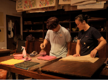八十年前,武强年画的刀痕里全是抗战烽火,《打日本救中国》刻着军民死战决心,《大战天津》画着同仇敌忾的抗争,每一刀都是艺术化作的 “武器”,记录着中华儿女以血肉筑长城的岁月。团队队员在博物馆尝试拓印:蘸墨、铺纸、轻擦,看着梨木板上的抗战纹样慢慢显形,指尖触到木版的凹凸,才懂当年艺人把呐喊刻进纹理的赤诚。