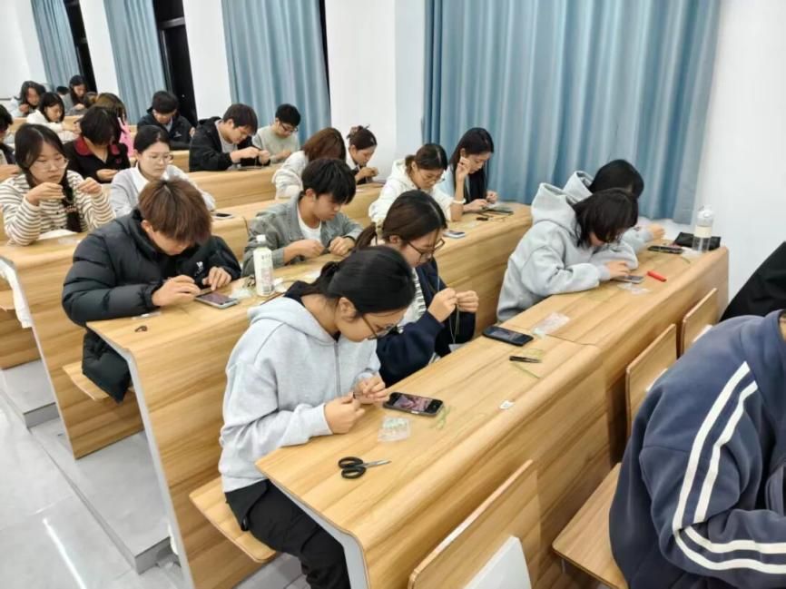 工作人员播放青提珠子葡萄挂件手工制作视频,并分发青提色玻璃珠、弹力线等材料。面对透亮的绿白渐变青提珠与串制工具,大家热情高涨却又有些不知所措,有人对葡萄串的珠子数量与松紧度犹豫不定,有人在青提珠与银色挂扣的搭配细节上举棋不定。很快,现场便呈现出互助友爱的热闹场景:手工串珠熟练的同学主动分享穿珠打结技巧、避免珠子滑动的小窍门;擅长创意设计的同学则帮忙构思葡萄串的层次感、搭配点缀小银珠。待青提珠子葡萄挂件作品完成,同学们迫不及待地展示成果,把晶莹饱满的“青提串”挂在展示区绳架上,拉着新认识的伙伴从不同角度欣赏珠子折射的光泽。每一串青提珠子挂件都凝聚着新生们的巧思与心意,尽显手工创作的趣味与初入校园的真挚情谊。