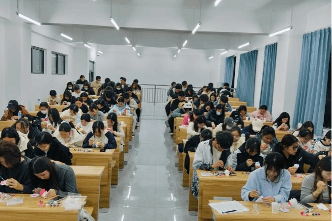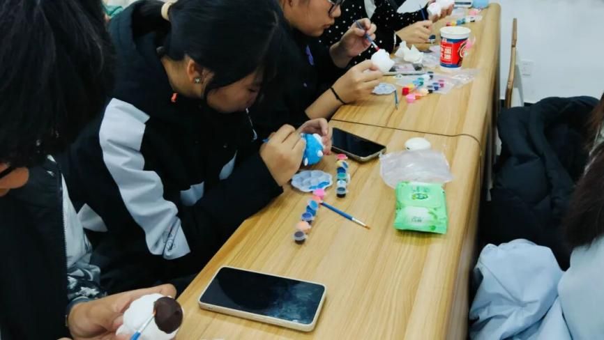 工作人员分发白坯石膏娃娃、丙烯颜料、画笔等材料。在活动过程中,有人对配色方案犹豫不定,有人在细节勾勒的手法上举棋不定。很快,现场便呈现出互助友爱的热闹场景:绘画功底扎实的同学主动分享调色技巧、均匀上色的小窍门;擅长创意设计的同学则帮忙构思图案布局、搭配点缀装饰。待石膏娃娃彩绘作品完成,同学们迫不及待地展示成果,把色彩斑斓的“专属娃娃”摆在展示台上,拉着新认识的伙伴细细欣赏每一处精心绘制的细节。每个石膏娃娃都凝聚着新生们的巧思与心意,尽显手工创作的趣味与初入校园的真挚情谊。