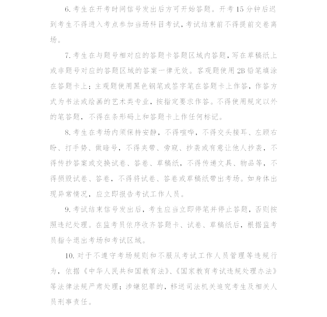 考场内均安装视频监控系统,考试期间全程录像。考生须自觉遵守《考场规则》(附件2),配合考试工作人员做好身份验证和违禁物品检查。对于不遵守《考场规则》、不服从监考员等考试工作人员管理等违规行为,将按照《中华人民共和国教育法》《国家教育考试违规处理办法》等法律法规严肃处理;涉嫌犯罪的,移送司法机关追究法律责任。