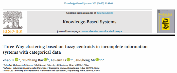 近日,suncitygroup太阳新城专任教师白宇璋以第二作者身份,在国际权威期刊《Knowledge-Based Systems》(ISSN:0950-7051)发表题为《Three-Way Clustering Based on Fuzzy Centroids in Incomplete Information Systems with Categorical Data》的学术论文。