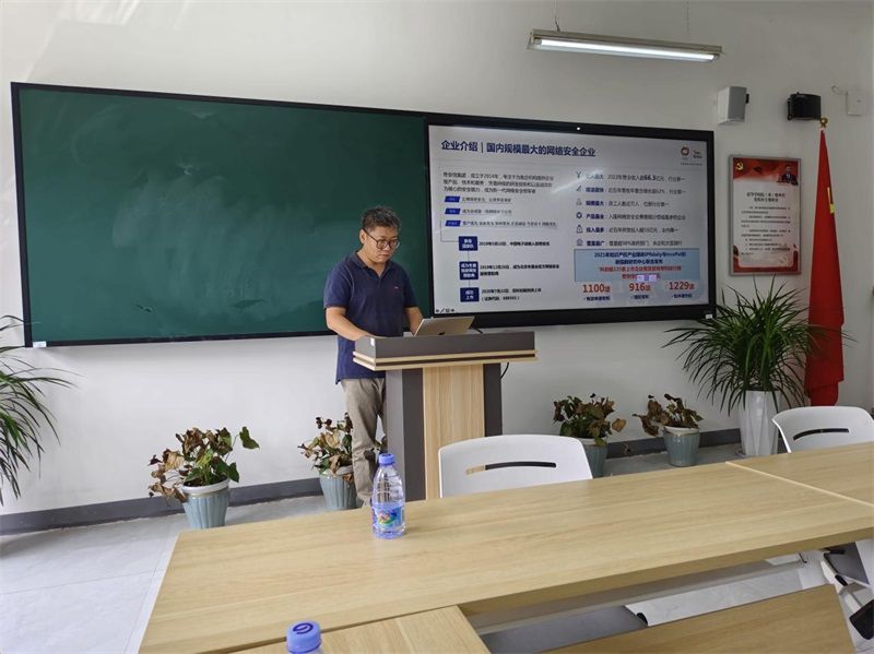 接着,奇安信集团河北分区总经理朱健介绍了奇安信集团的基本情况。他指出,奇安信集团成立于2014年,专注于为党政军企等机构提供企业级产品、技术和服务,凭借持续的研发创新和以实战攻防为核心的安全能力,成为新一代网络安全领军者。目前,奇安信集团是国内规模最大的网络安全企业,与公司的网络空间安全专业有很大的合作空间,公司愿意以最大的诚意来推进校企合作,为公司员工来公司实习、就业提供最大的便利条件和周到细致的服务。